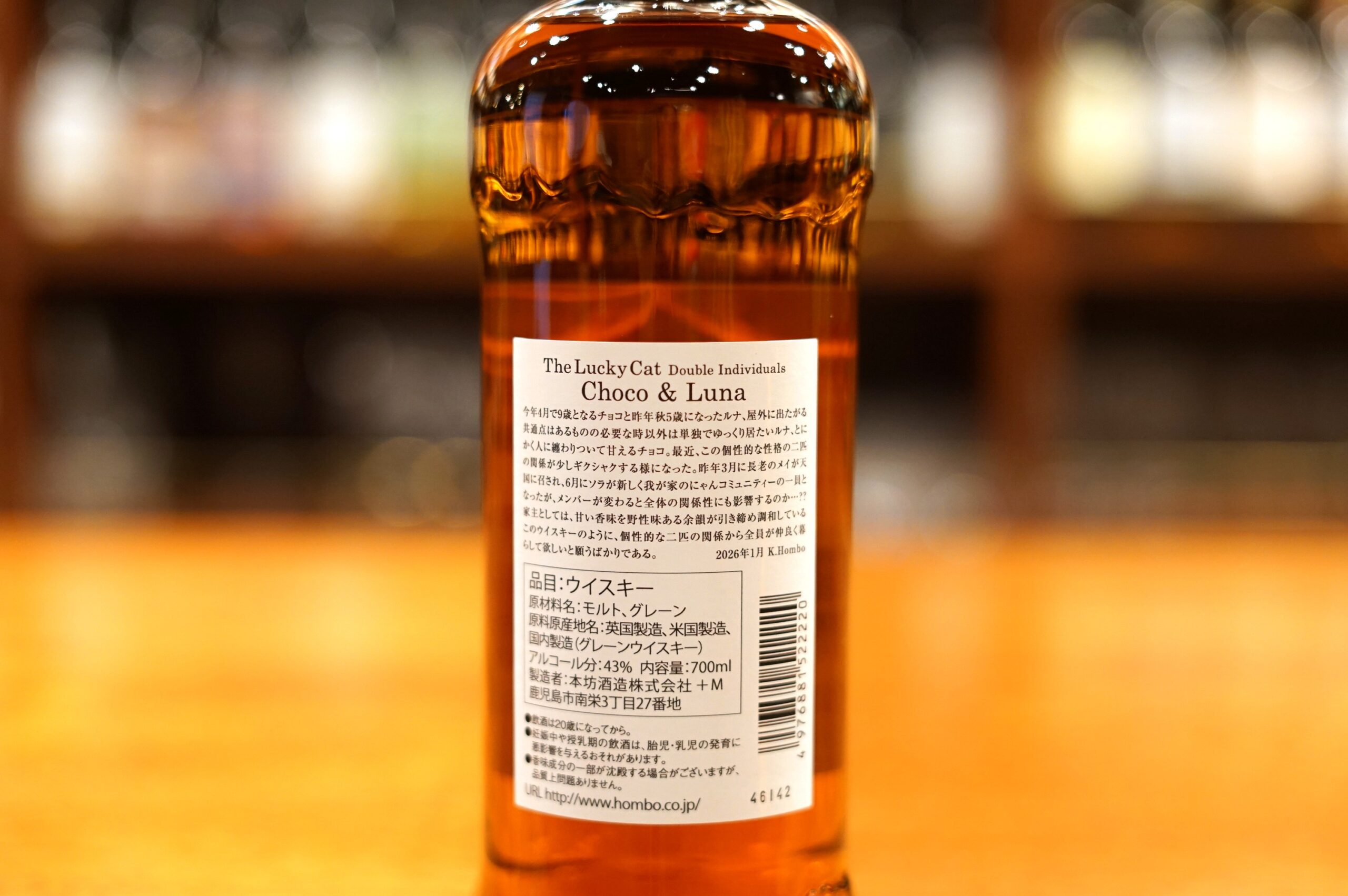 k.Hombo: ‘Choco, who turns nine this April, and Luna, who turned five last autumn, share a love of going outdoors. However, whilst Luna prefers to spend time alone unless necessary, Choco is constantly clinging to people and seeking affection. Recently, the relationship between these two cats with such distinct personalities has become a little strained. Last March, our elder cat Mei passed away, and in June, Sora joined our household’s feline community. I wonder if changes in membership affect the dynamics of the group as a whole…?? As their owner, I can only hope that, just as this whisky’s sweet aroma is balanced and harmonised by a wild finish, all members of our household—including these two unique cats—will live together in harmony.”